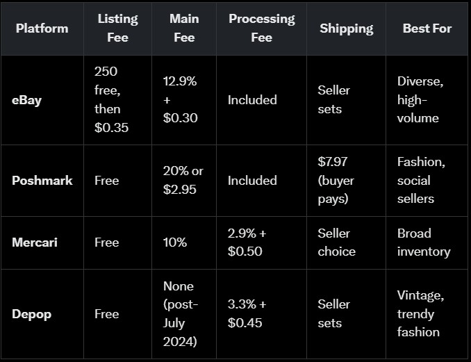 Your ideal platform depends on what you’re selling and how much effort you’ll put into pricing. eBay’s a beast for volume and variety but chews into profits. Poshmark’s high fees are offset by its engaged fashion crowd. Mercari’s balance of low fees and flexibility suits casual resellers, while Depop’s fee-free shift is a game-changer for trendy flips. Know your costs, test your prices, and watch those margins grow!